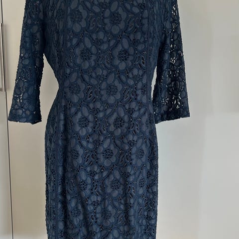 Days Like This festkjole i størrelse 46. Kjolen er blå og laget av nylon. Den har lange ermer og en kombinasjon av teksturer på overdelen og skjørtet. Overdel med mønster i fløyel. Lange lette ermer.