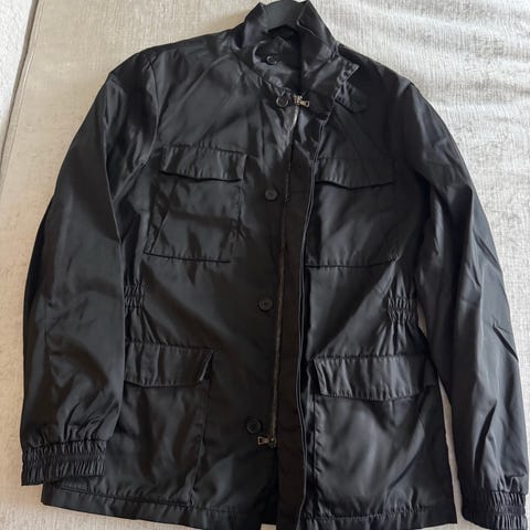 Den andre jakken er av svart kunststoff i klassisk Prada-stil, med branding på mansjetten.