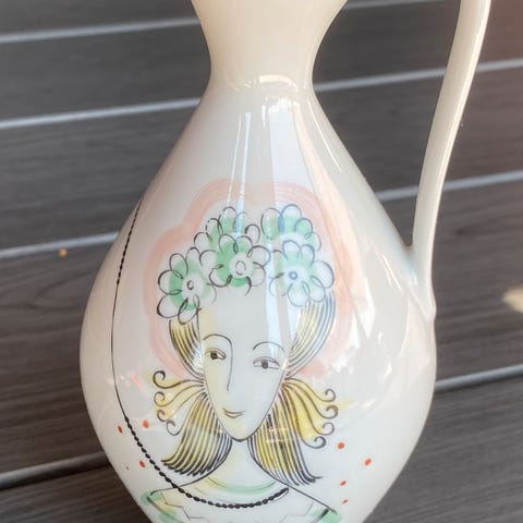 Supersøt vintage veggvase/ liten potteskjuler i keramikk. Jeg er ganske sikker på at denne er norskprodusert og den er i helt super stand, litt misfarging i bunnen på innside, men dette vises ikke når den er i bruk. Ca 10 cm høy, åpningen er 10x8 cm øverst.