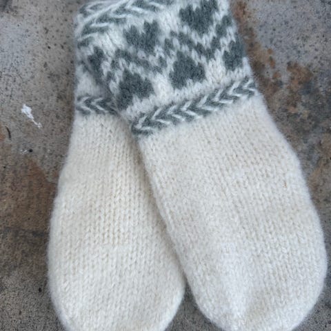 🩶🤎Tovede Hjerteslag votter til dame str m fra MaBe design. Strikket i 100% kvalitetsull fra Rauma garn, Vams. Strikket i de nydelige og delikate fargene grønn, hvit med brune hjerter og detaljer🤍🤎