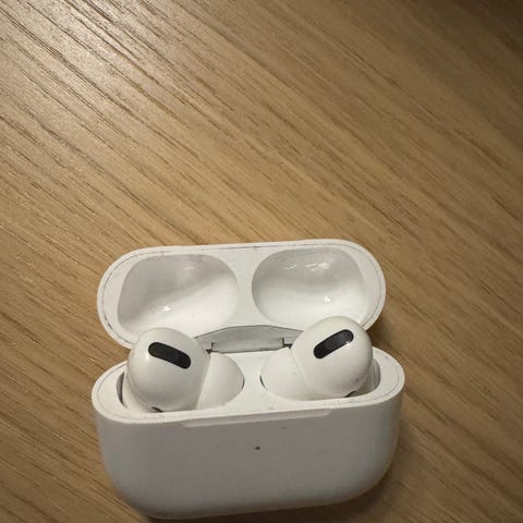 Apple AirPods Pro trådløse hodetelefoner i hvit farge. Case funger fint men hodetelefoner til deler fordig de lager merkelig lyder.