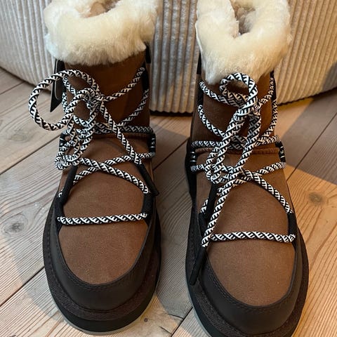 Støvlene har snøring og er designet for vinterbruk med isolerende materiale for varme og komfort. Vannavvisende Glidelås på siden, så lette å få på. Helt nye!