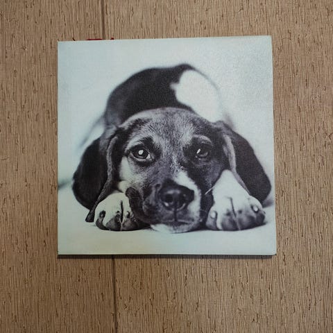 Selger en metallplate med omrisset av en spitzhund trykket på. Sort bakgrunn, hvit print. Selges med oppheng som fulgte med. Aldri tatt i bruk.