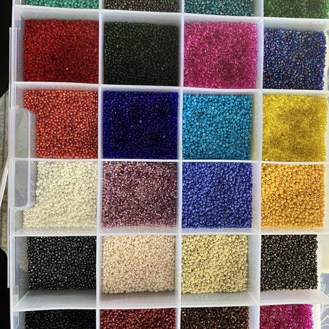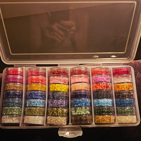 Rocailles perler i assorterte farger, levert i 12 pakker. Hver pakke inneholder små runde perler som kan brukes til smykkelaging, dekorasjon og håndarbeid. Noen er åpnet og tatt litt av, men alle er så og si fulle