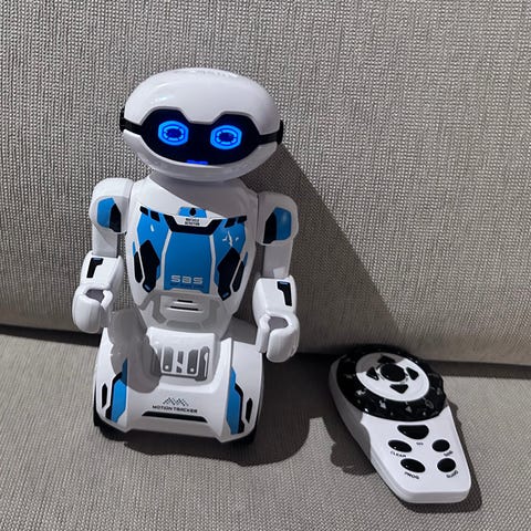 Silverlits lekerobot Makcrobot er en stor robot med mange spesielle elementer! I tillegg til hjulene, har Macrobot bevegelige deler på alle sider, og øynene lyser opp i 3 forskjellige farger. Med den inkluderte programmvaren kan du be ham transportere små ting. han kan huske en rute han har dratt og gjenta denne ruten uten problemer. Macrobot har en opptaksfunksjon som lar deg ta opp opp til 3 tekster, som han kan lese opp i robotstemmen sin. Fjernkontrollen lar deg gjøre all slags forhåndsprogramerte handlinger og når du kobler til flere MacroBots kan de kommunisere med hverandre. Dette produktet anbefales til barn fra fyllte 5+ år.