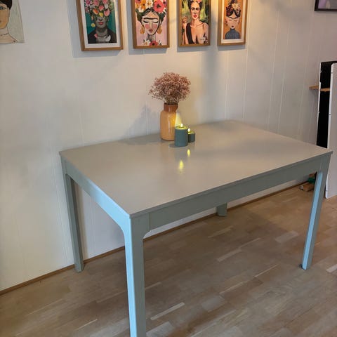 Flott, stort spisebord med svart svart beiset overflate og naturfargede ben.