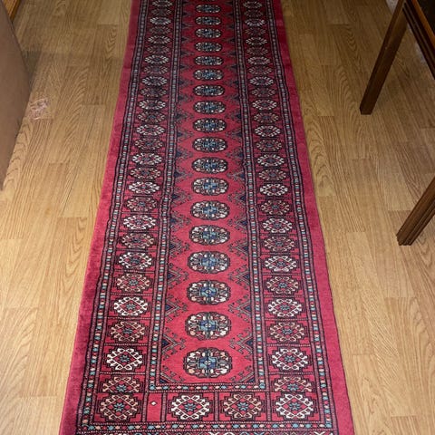 Helt og fint «persisk» teppe i blått, burgunder, gammelrosa og beige/offwhite. Ikke merkelapp, og ikke håndlaget. Ikke så tykt, men det ligger stødig.