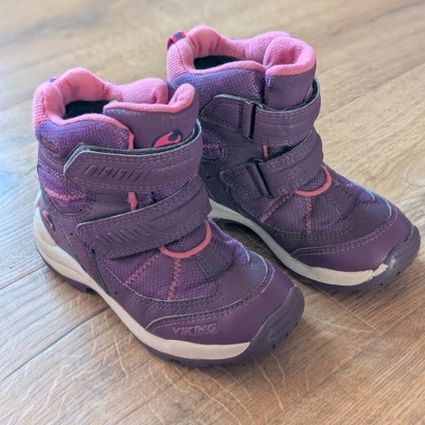 Viking barnesko for jente i størrelse 28. Skoene er lilla og har borrelås for enkel justering. Egnet for barn og laget med materialer som gir komfort og støtte.