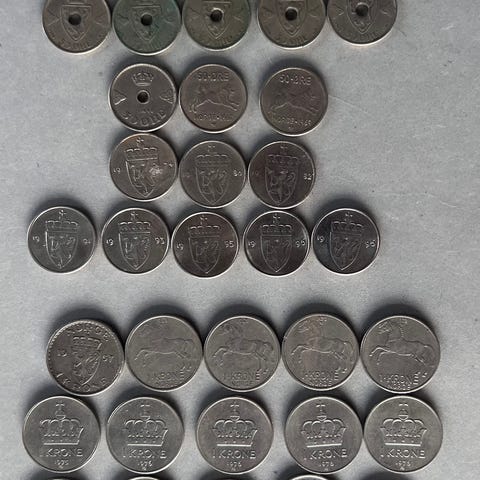 Godt utvalg av krone og øre-mynter nevnt i overskriften.