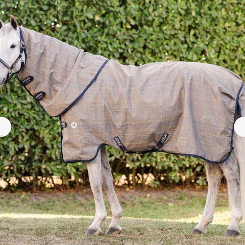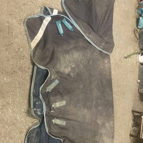 Amigodekken med hals 250g str 145. Helt og pent bortsett fra ene feste til borrelåsen til halsen har gått litt opp i sømmen. (Se siste bildet).Blir ikke vaske. Kan sendes for kjøpers regning