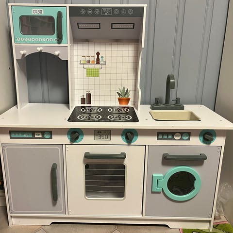 Lysrosa lekekjøkken i tre med komfyr,kjøleskap,mikrobølgeovn,vask med kran,telefon.Kranen er noe løs,men kan lett strammes bedre opp av neste eier. Et par bruksmerker.