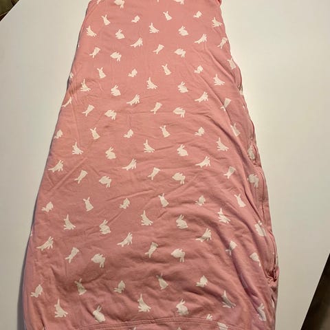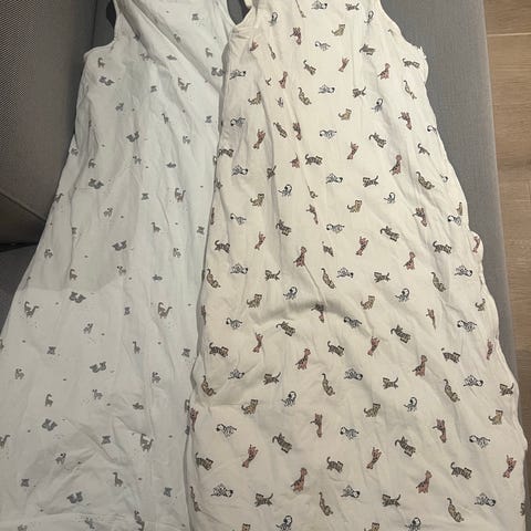 Varmforet nattpose eller sovepose TOG 2,5 størrelse 98/104 med bomullstrekk på utside og innside. Mønster med afrikanske dyr og palmer. Soveposen er fra H&M og har trykk-knapp og glidelås på den ene siden. Til bruk innendørs når baby skal sove.