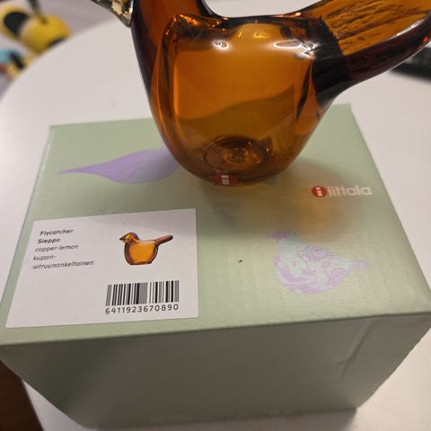 Laget av glass med detaljer som etterligner fjærmønster. Designet av Oiva Toikka, kjent for sine kunstneriske glassfigurer.
