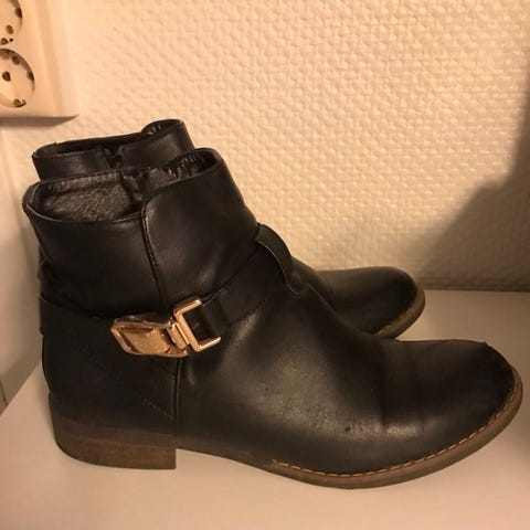 Skoen går midt på leggen, har glidelås i front og er i størrelse 40