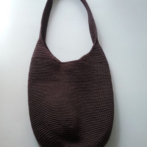 Heklet veske laget av bomull. Vesken har en naturlig beige farge og en brun skulderrem i imitert skinn. Passer til hverdagsbruk og mindre personlige eiendeler.