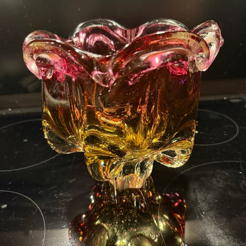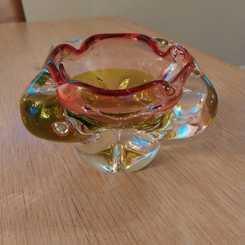 To stykk Josef Hospodka boller fra 1950/1960 tallet, i rosa og gul i god stand. Den runde er 15,5 cm bred og 12,5 cm høy. Den firkantede er 13,5 cm bred og 12 cm høy. Josef Hospodka samarbeidet med Magnar glassverk på 1960 tallet. Prisen 450,- er pr. stykk. 900,- for begge.