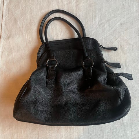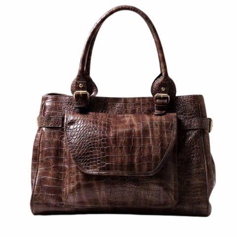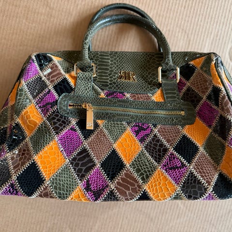 Skinnveske laget av lær i brun farge. Vesken har to håndtak og en avtakbar skulderrem. Innvendig rom med flere lommer for oppbevaring.