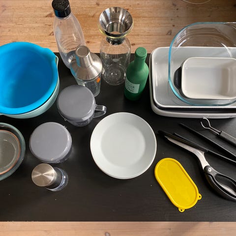 Kjøkkenpakke med kokkekniver, kasseroller, toastjern, vinglass og mye mer