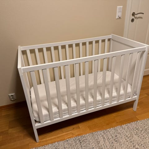 IKEA Sundvik sprinkelseng i hvit farge. Med madrass som passer, dyne, laken og sengetøy. Har stått hos besteforeldre og er ikke brukt. Passer for små barn og babyer, laget av slitesterkt materiale. Selges samlet. Hentes på Kolsås. Lengde seng 125 cm, bredde 66,5 cm, høyde 85 cm (utvendige mål). Dyne 110x125 cm. Nypris seng 1995,-