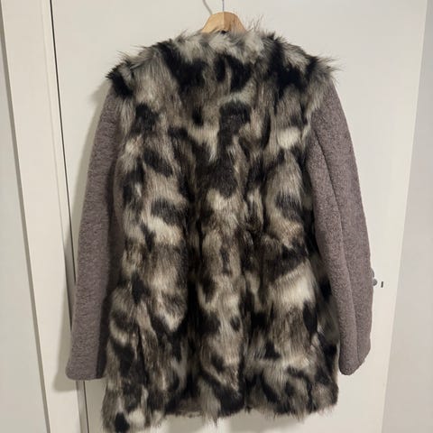 Apparence Paris Pen pelsimitat jakke med hette i en gylden brun farge, størrelse S for kvinner. Jakken er laget i Frankrike og har en myk tekstur med knapper foran og lommer på sidene. Egnet som yttertøy for kjøligere vær.