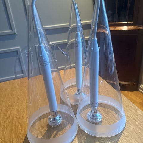 Stor taklampe i glass av merke FLOS type BUTTON HL. Laget i Italia. Den har plass til 5 stykk pære med G9 sokkel. Følger ikke med fungerende pære, disse må kjøpes. De finnes også i LED variant.