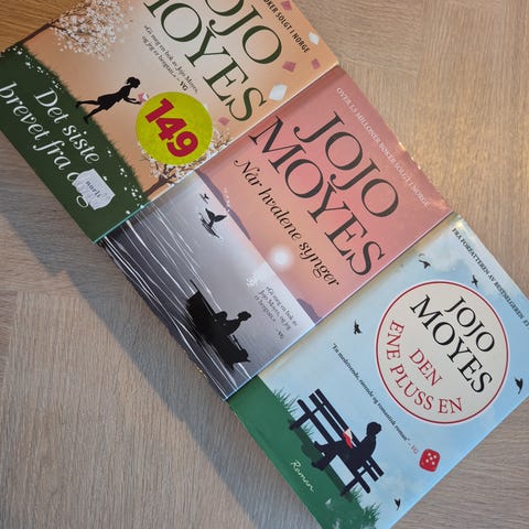 Jojo Moyes Romanser Bokpakke med titlene 'Et helt halvt år', 'Etter deg' og 'Fremdeles meg'. Bøkene er på norsk og tilhører sjangeren romanser. Selges i hovedsak samlet for 50 kroner.