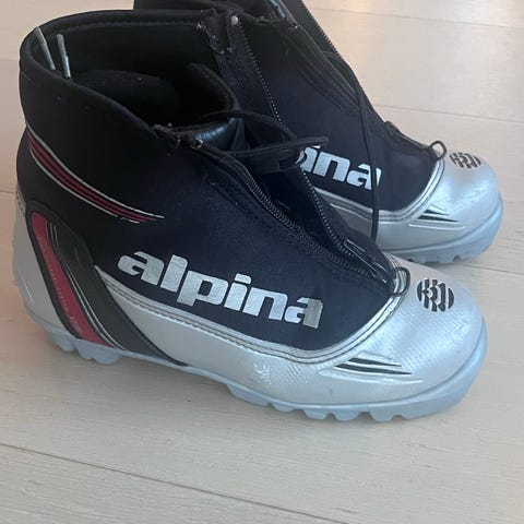 Pent brukte skisko til langrenn. Modell Alpina T8, str 34. Skiskoen har dobbel pløse og glidelås lukking, som beskytter godt mot snø og kulde.