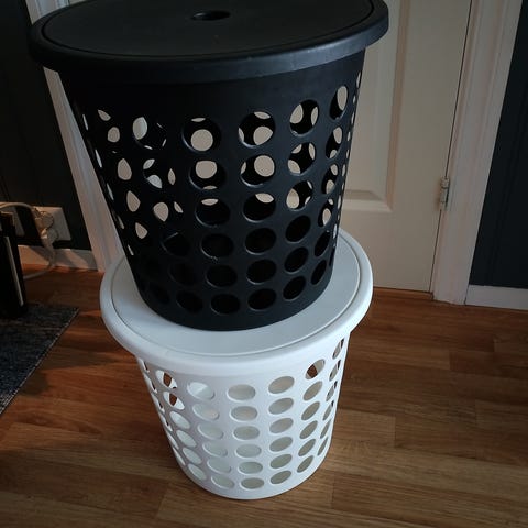 tøykurv i beige farge. Kurven er laget av flettet materiale og har en rund form med en flat bunn for stabilitet. Egnet til oppbevaring av klær, leker eller andre husholdningsartikler.