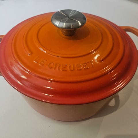 Selger denne da den ikke får plass på kjøkkenet og den kun er brukt noen få ganger. Den har ingen bruksmerker, men litt klister fra Le Creuset-etiketten på siden er der ennå.
