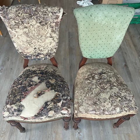 Antikk stoler (x6) til gis bort. Hvis du får stolene (x6) får du lenestolen gratis.