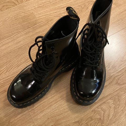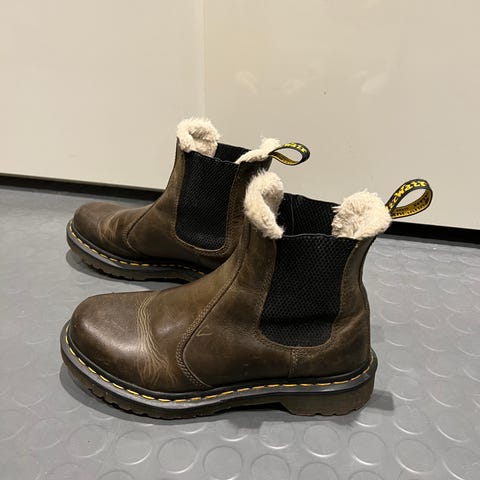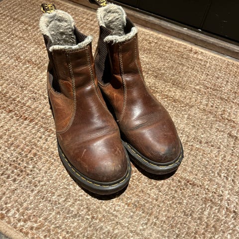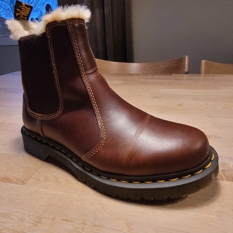 Dr. Martens støvler i størrelse 38 med rødbrun farge. Støvlene har en foret innside for ekstra varme og komfort. Laget i slitesterkt materiale, egnet for bruk i kaldere vær.