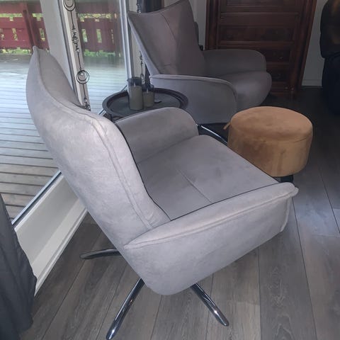 Pent brukte lenestoler i nydelig grå (antracit), med svart matt svingfot. Ingen skader på stolene, den ene er noe mer synlig brukt men begge er generelt i god stand. Den ene fotskammelen har en liten skade på undersiden, dette er bare synlig når den vendes. Se vedlagt bilde.