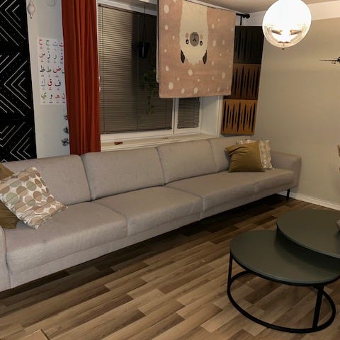 Sofaen kan speilvendes, boret to hull (ikke synlig) da den skulle speilvendes, men har funnet festene igjen. Nakkepute medfølger.