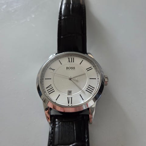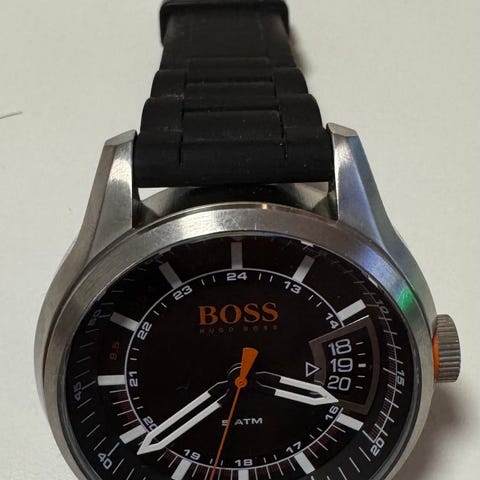 Hugo Boss herreklokke med svart urskive og svart rem. Klokken har en rund kasse med tydelige hvite tall og visere. Remmen er laget av et fleksibelt materiale.