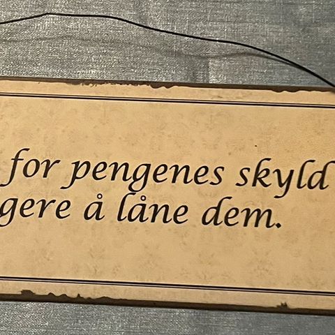 Pynteskilt i tre med solid oppheng i grovt tau.