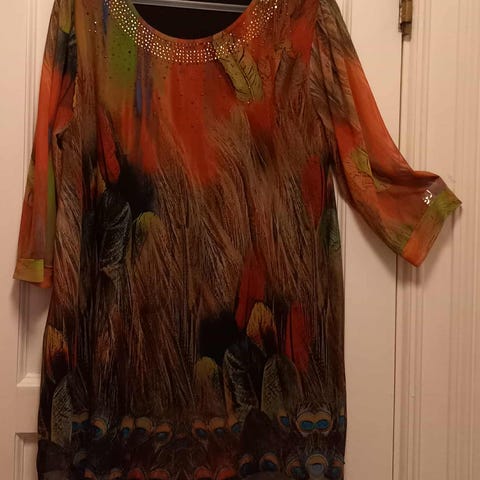 Anyday bluse i størrelse L med flerfarget blomsterprint. Blusen har perle- og krystallpynt langs halsen og er laget i lett materiale.