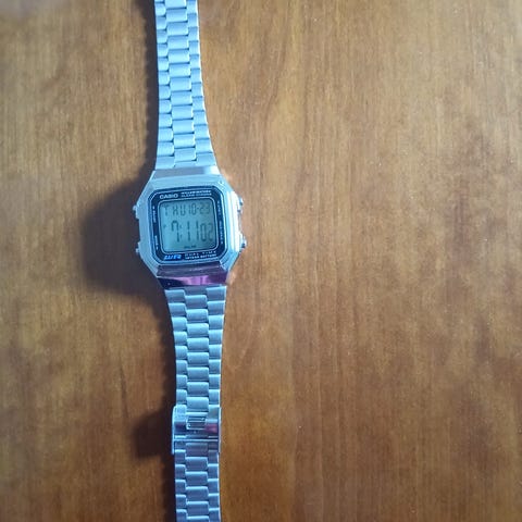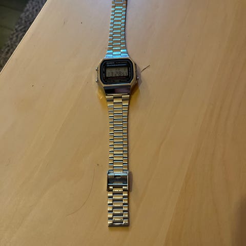 Casio digital herreklokke med stålarmbånd. Klokken har kvadratisk urskive med digitalt display som viser tid og andre funksjoner. Klokken er designet for herrebruk og har et robust metallisk utseende.