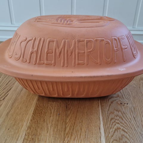 En stor og solid leirgryte med glasert bunn inni. Lokket er 35 cm på det lengste, underdelen 33 cm. Ca 17 cm høy. Brukt et par ganger kun. Fantastisk måte å lage mørt kjøtt av alle slag, grønnsaker etc. Selges rimelig da har to.
