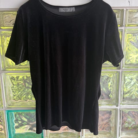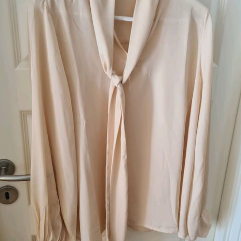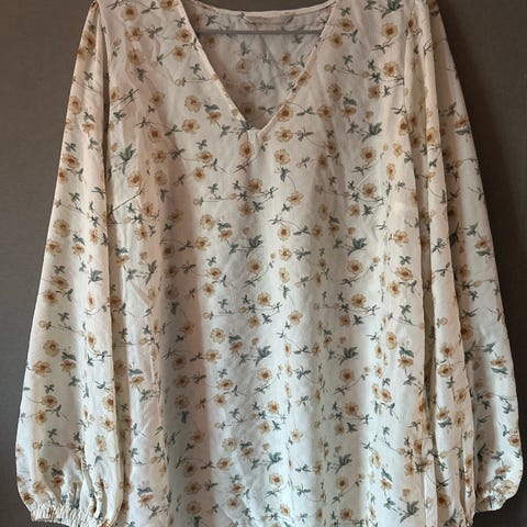 Blusen har et mønster i rosa og hvitt med lange ermer og en V-utringning. Lappen er tatt av, men er aldri brukt.