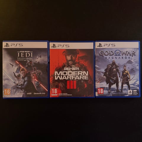 Pakke med flere Playstation 5 spill inkludert Call of Duty Black Ops 6, Call of Duty Modern Warfare III, Call of Duty Vanguard, Call of Duty MWII, FIFA 23, FIFA 22, FC 25 og Need for Speed Unbound. Spillene dekker flere sjangere som action, skytespill og sport.