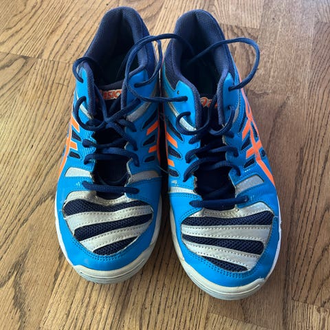Asics Gel-Tactic innendørs sko i størrelse 42,5. Skoene er gule med svarte og oransje detaljer. Laget for innendørs bruk med gummisåle for godt grep på innendørsflater.