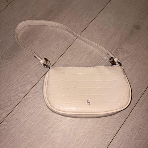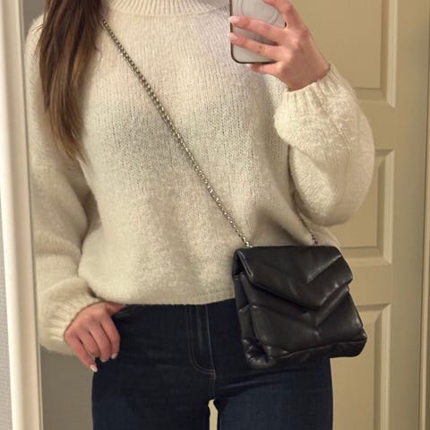 Nydelig, svart veske med påsydd rutemønster fra Gina Tricot. Den har en praktisk ekstra lomme på innsiden som lukkes med glidelås. Vesken er ca 21 cm bred.
