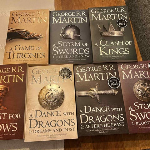 Selger et komplett boksett med de fem første bøkene i den episke serien "A Song of Ice and Fire" av George R.R. Martin (kjent fra TV-serien Game of Thrones).