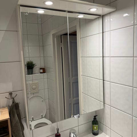 Baderomsmøbel i hvit høyglans med servant og speil. Inkluderer skap under servant, overskap, speil med hyller og servantbatteri. Møbelet har god plass til oppbevaring og er laget for baderomsbruk. Noen mindre slitasjer og en synlig skade.