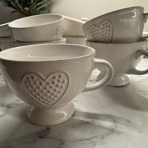 Håndlagde tekopper i keramikk med svart glasur. Koppene har noen skjønnhetsfeil (små områder der glasur mangler) og er i litt ulik størrelse. Varierer i høyde mellom 11-12 cm. Selges samlet for 100,- . På bildene vises 6 kopper, men jeg selger 7 stk.