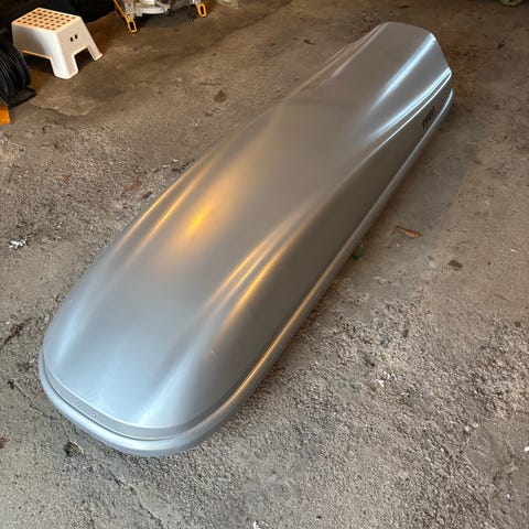 Thule takboks i svart farge med aerodynamisk design. Egnet for montering på takstativ for ekstra bagasjeplass ved transport. Boksen er lite brukt.