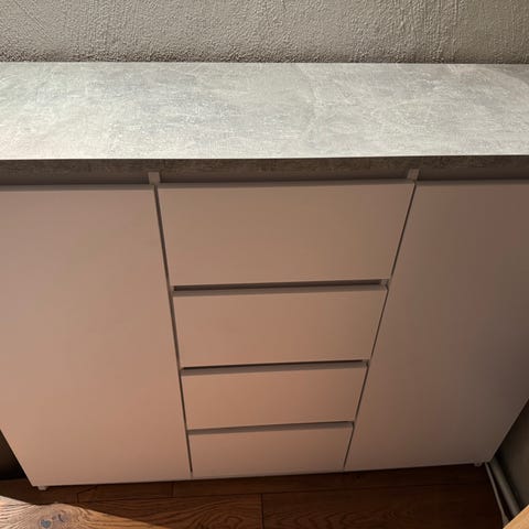 Sort kommode selges. Rotting i plast. Kommoden har stått i et drivhus det siste året, og derfor har deler av rottingen "krympet" på grunn av varmen. Denne kan lett skiftes ut og erstattes av ny/annen type. Ny pris 4500.
