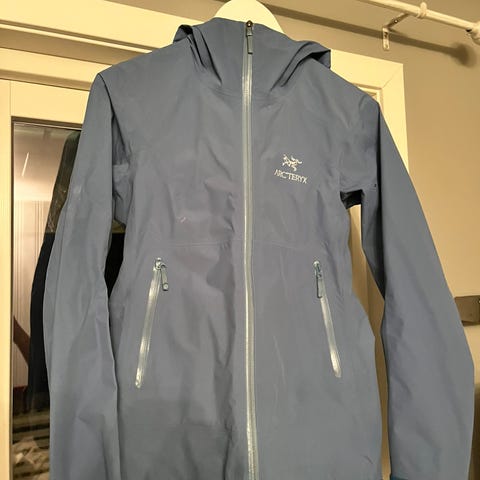 Jakken er pent brukt og fin, men limet i strikken rundt livet er løsnet noe, kan sikkert limes på nytt.