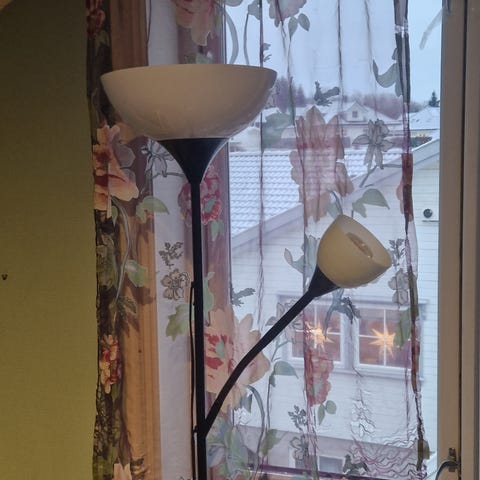 To lamper i en moderne stil på samme, solide lampefot. En uplight-lampe som kan dimmes og gir masse lys, og en leselampe litt lenger ned som er enkel å bøye dit du vil.