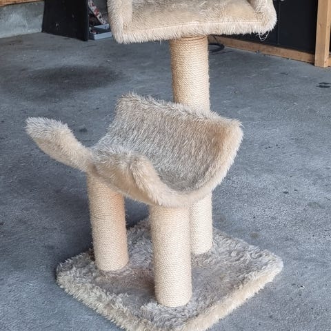 Kattetre med flere nivåer, inkludert liggeplasser og klorestolper. Farge beige med mykt materiale som gir komfort for katten. Passer for katter som ønsker å klatre, hvile og leke.